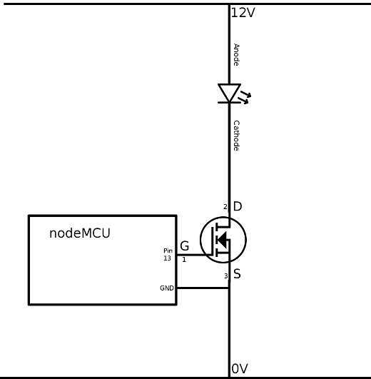 I’ve highlighted the pins on the MOSFET as I struggled a bit finding the relevant information in the documentation. The ground of the nodeMCU/ESP8266 must be tied to the ‘source’ pin of the MOSFET, so the grounds are equal.